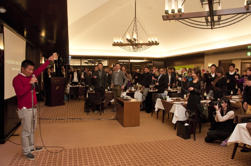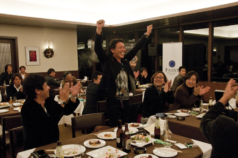 どっぷりと陽が落ちた午後4時すぎ、レストランラウンジに、プレイを終えたプレイヤ-たちが集合してきました。乾杯のご発声は、ファウストゴルフチ-ムのキャプテン西林基樹さん。「来年もハッピ-なゴルフをして行きましょう」とスピ-チで会場を沸かせ、パ-ティ-が始まりました。