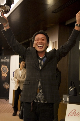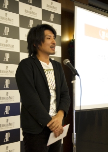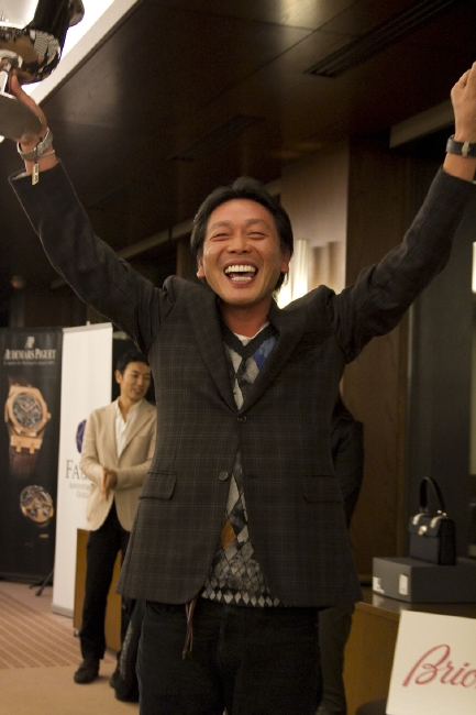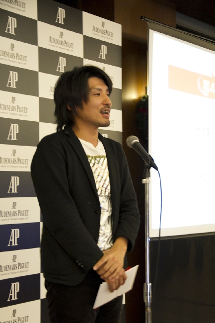 次に、ついに今回の順位発表です。ニアピン賞から各賞の表彰が始まりました。ホ-ルインワン賞では「アウディA1」、「オ-デマ ピゲ ロイヤル オ-ク オフショア クロノグラフ」などが用意されていましたが、今回もホ-ルインワンは出ずじまい。ですが、それで賞品もなしでは無粋だろうと、急きょ、主催者オーデマ ピゲの麦野豪さんから、新たに「アウディA1」を競うゴルフコンペを2012年に催すことが発表され、会場はドッと沸きました。