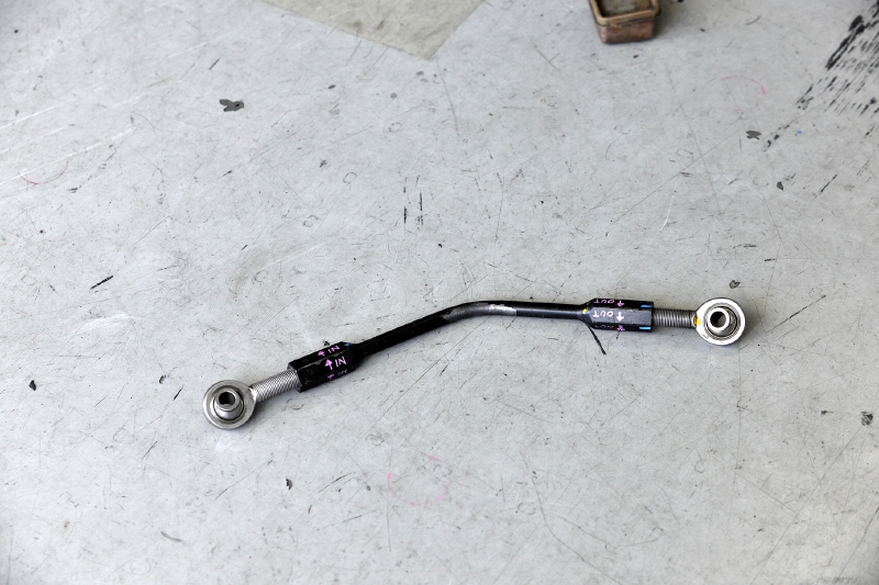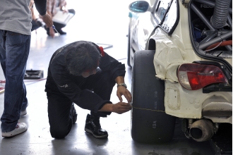 すぐさまリフトされたマシンは、タイヤ&ホイールがはずされ、足回りチェックだ。隣のペトロナスチームのメカもどういう状況なのか心配顔。チェック後さっそくバラされた左フロント。交換されたパーツは「への字」に曲がったタイロッド1本。BMW Z4の足回りはフォーミュラーカーと同じ構造で、細いロッドが曲がることで追突のショックを吸収したのだ。ここまでの作業は約10分。
