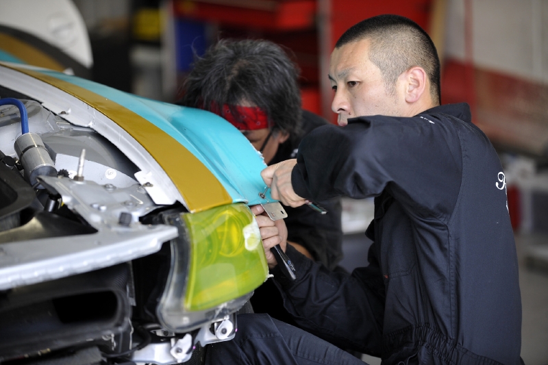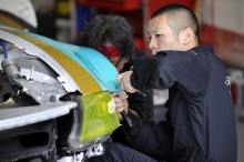 土曜のレース進行はイベント満載のためタイムスケジュールどおりには進んでいなかった。Bドライバーの佐藤は、予選に間に合う可能性を信じて乗れる体制で待つ。ところがフロントカウルが予想以上のダメージ。ボディ側のステイが飛んでしまっている上に、予備のフロントカウルには補機類が付いていない。すべてのパーツを壊れたカウルからはずして付け替えねばならない。リア周りのチェックや補修も追いつかない。気温は上がり続けピット内は35度。Bドライバーの予選アタックを告げるストレートの爆音に、佐藤はレース用マスクを脱いだ。