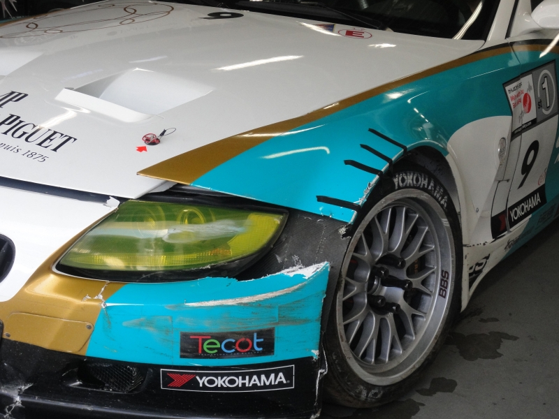 映像上は大きなクラッシュには見えないが、無線で確認するとフロントとリアをヒットしているようだ。幸い、Bドライバーの予選までは他クラスの予選を挟んで30分の時間がある。レッカー車に引かれてピットに帰ってきた様子では、フロント左のカウルが割れ破損している。ダメージの度合いは? 予選を走れるのか? ピット内は騒然としているが、ここから先はメカニックの仕事だ。ドライバーも関係者も遠巻きにするしかない。