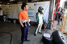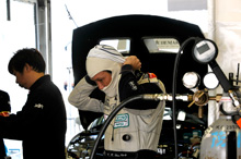 無線で詳しく状況を聞くと、右コーナーで横Gがかかると、プスンプスンと息つきが起こるらしい。これは昨年の「もてぎオーバル」でも出た症状。その時は、燃料ポンプをセコンドに変えたら直ったので、今回も同じようにして様子見。が、今回は症状が改善されない。ピットに戻ってきてチェックしては挽回不可能になる上、症状が悪化するおそれもある。ある程度のラップタイムで走れるなら、そのまま走行するのがベスト、タイム差はたっぷりある。