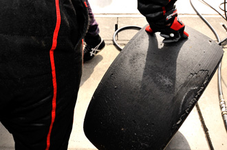 2スティントを走って外されたタイヤは、アウトサイドのラバーが剥がれ、ワイヤーが見える状態。メカからは「よく走ったね岡本ちゃん」と、我慢の走行をした岡本をねぎらった。ハードな役割は十分過ぎるほどこなしたのだ。