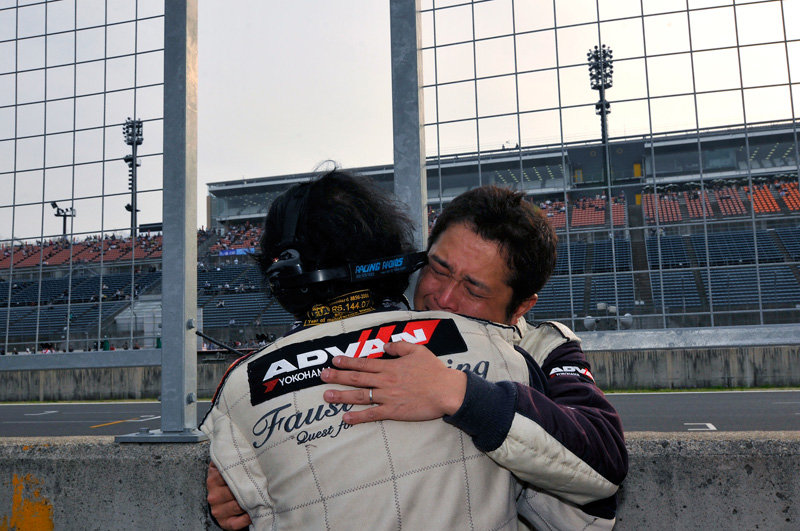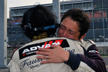 ウイニングランをして戻ってきた#9 BMW Z4から降りてくる山野。出迎える堀、岡本とハイタッチ、そしてハグ。岡本は大泣きだ。チームスタッフはもちろんライバルチームのドライバー、関係者からも握手の嵐。決勝を走れなかった佐藤からの祝福メールも届いた。