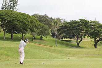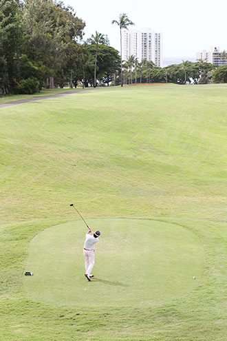「もう焦りまくりでしたね。彼らを見てると前日に僕らが練習で打っていた場所や狙うところと全然違うんですよ。そうか、このホ-ルはあっちを向いて打つのかっていうのがたくさんあって、正直、コ-スをあまりにも知らなさ過ぎましたね。しかも、テ-ショットはまずまずやったけど、セカンドでミスって……。やばい。このままだと最下位になるんじゃないか。マ-クさんに恥をかかせてしまう。そういうことばっかり考え始めると、今度は手が動かなくなってしまった。もう、完全に自滅でした」