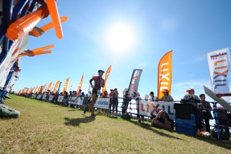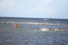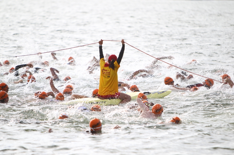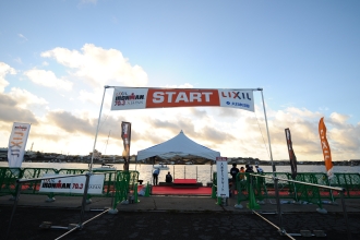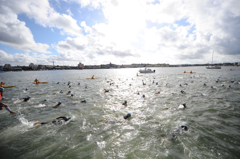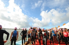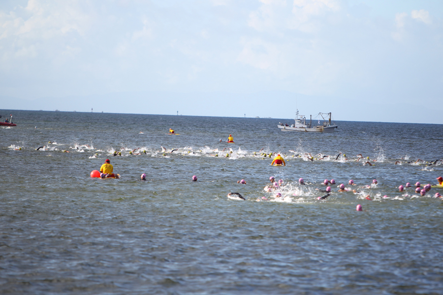 スタートは、年齢別に約200人ずつに分けられたカテゴリーごとに、スイムの着水姿勢から3分間隔でスタートするウェーブ方式だ。スイムのコース短縮に伴い、予定時刻より10分遅れとなった7時40分。第1ウェーブの選手たちがフォーンの合図と共に、一斉に水しぶきを上げながら沖へ向かう。いよいよ、闘いの幕は上がった。