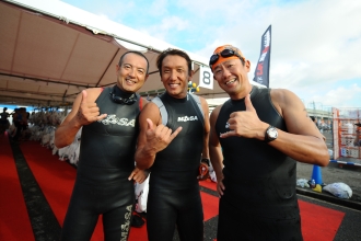 元プロ野球選手である古田敦也さん(右)と稲本(中央)は、2010、2011年のホノルル大会に共に参加するなど、トライアスロンを通じて親交がある。ちなみに古田さんはその2010年の活動で「JustGiving特別賞」を受賞。スイムを皮切りに、波乱のドラマが幕を開ける