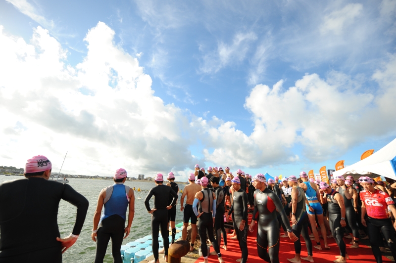 スイムのスタート地点。波の高さなどについて慎重に協議がされ、短縮コースで実施されることが決定した。