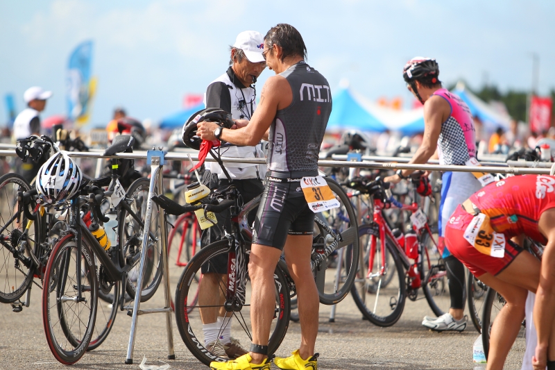 今回、M.I.T.会長の髙島郁夫(同連載Vol.2に登場)がやむなく欠場となった今大会でチームを牽引する稲本は、レース前日のブリーフィング会場でチームメイトを集め、輪の中心に一人の男を招き入れた。日本トライアスロン界の先駆者であり、M.I.T.のスーパーバイザーでもある白戸太朗だ(過去のロングインタビュー記事はコチラ)。今回の大会実行委員長を務める白戸は、チームメイトたちを前に短い言葉で明快なアドバイスを告げる。