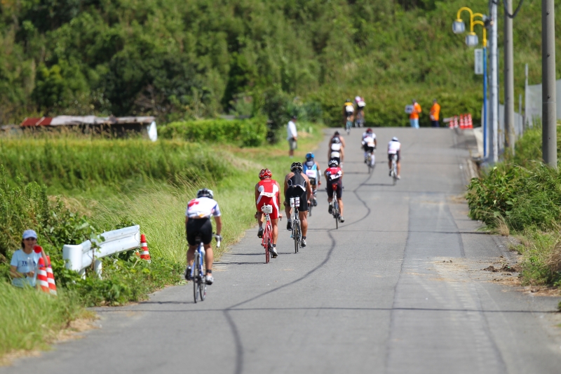 90kmという長く、孤独なバイクコース。時間にして3~4時間ものあいだペダルをこぎ続けなければならず、常滑市の丘陵地帯に張り巡らされた複雑に入り組む周回コースでは、強烈なアップダウンが何度も何度も選手たちを襲うこととなる。最初は余力を残して坂を駈けあがっていても、後半になるにつれ、蓄積した疲労は確実に選手の“足”を奪っていき、同じ登り坂でも何倍もの辛さとなってのしかかってくるのだ。