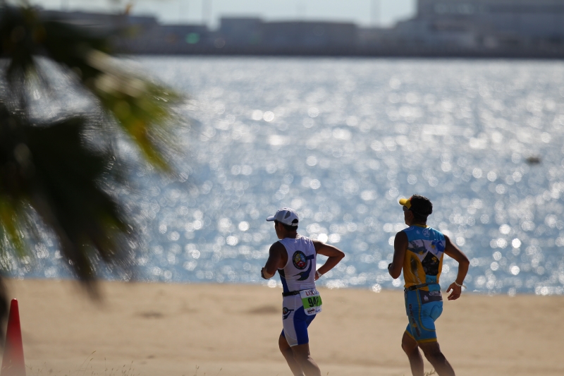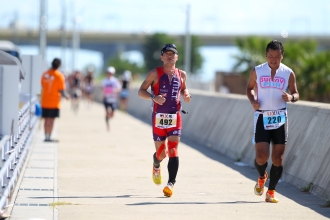 この日、セントレア付近の最高気温は32℃を超え、猛烈な残暑を記録。バイクで体力、気力共に激しく消耗した選手を待ちかまえていたのは、陽光を遮るもののない、海岸沿いの灼熱のランコースだった。穏やかな水面を照らし、シーリゾートのような美しい眺めを演出する強い日差しは、強烈な牙となって選手に襲いかかった。