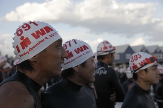 それからおよそ10分後、稲本がトランジッションエリアへ現われた。スイムに要した時間は1時間30分49秒だった。全体では984位、40歳から44歳のエイジグループでは153位である。彼もまた、ほぼ予定どおりのタイムを弾き出していた。