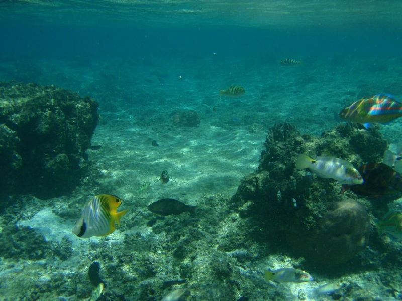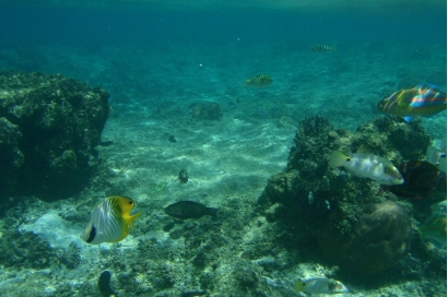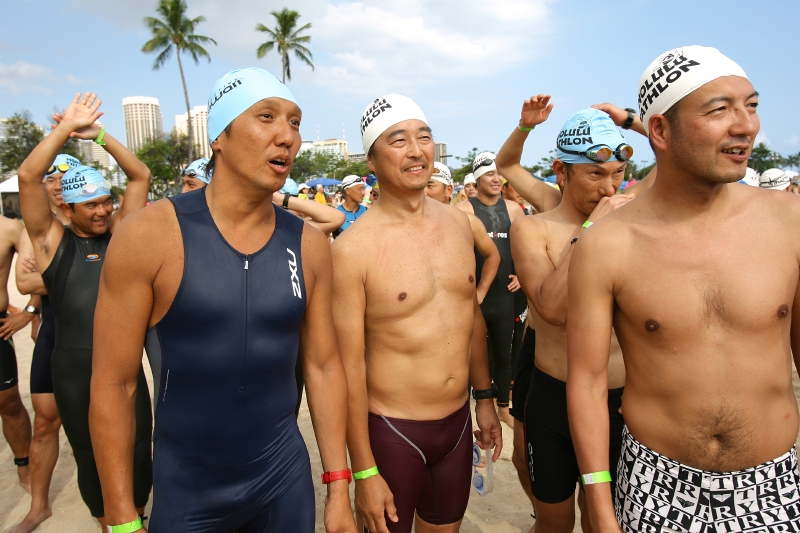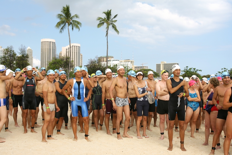 ホノルルトライアスロン2009のスイムスタート直前。髙島をはじめ、M.I.T.、アラパ、トライアスロンボーイズといったトライアスロンチームの面々が見える。