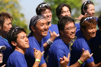 ホノルルトライアスロン2009のフィニッシュ後。自身が監督を務めるM.I.T.の面々と。
