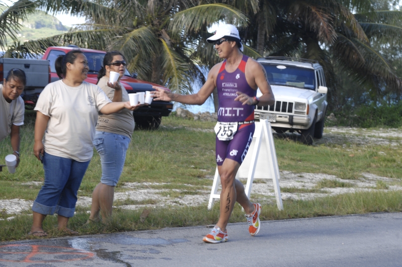 同じくランのエイドステーションで。地元の島民からドリンクを受け取る。