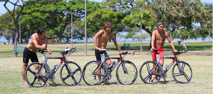 髙島(左)、稲本(右)、そして白戸太朗(中央)。ロンドン・マラソンが3人をトライアスロンで結びつけた。 ホノルルトライアスロン2009のフィニッシュ後の1コマ。3人の愛車はアスロニアのオリジナルTTバイク「MOSA」だ。