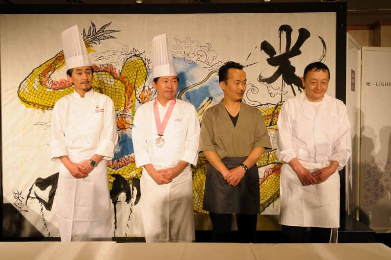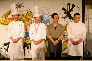 写真左から、「ロレオール」伊藤勝康氏、「アル・ケッチャーノ」の奥田政行氏、「UMU」ロンドンの石井義典氏、チューリッヒ「BIMI」の西浜勝氏。