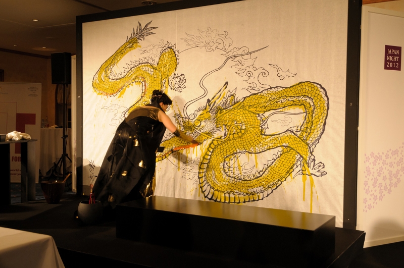 そのほか、女流書家の紫舟さんによる「書×アート」の企画では、書と龍の絵で日本の力強さを表現。来場者の名前を漢字で表現するサービスは行列ができるほどの人気だった。またメディアプロダクションTEAMLABによる映像インスタレーションが会場を彩り、日本を代表する俳優・渡辺謙氏が行なったスピーチに人々は聞き入った。「これまでの日本のイメージが変わった」「過去最高のジャパンナイトだった」などと来場者からの賞賛の声が多数あり、「JAPAN NIGHT 2012」は大成功のうちに幕を閉じた。
