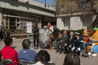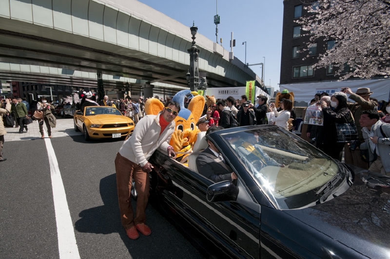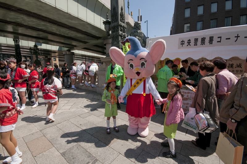 日本橋でのパレード中、警視庁のマスコットキャラクター「ピーポくん」とともに。