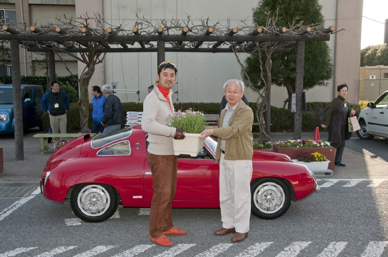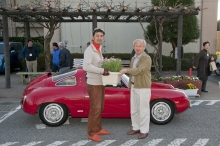 だが、今年はもうひとつ大切なプログラムがあった。13時から出発セレモニーが行なわれたのだ。最終目的地の気仙沼へ届けるお土産を、木村が預かるのである。彼の身体に降り注がれた拍手は、これから始まる旅への期待の現われだったろう。木村が運転するフィアット・アバルト750レコルドモンツァは、たくさんの思いを乗せていく。
