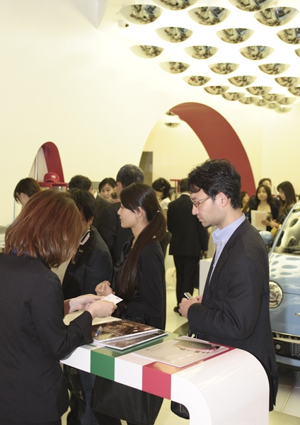 オークション当日、会場となった青山の「フィアットカフェ」には、多くのゲストが集まり、出品される貴重でユニークなアイテムが一堂に展示されました。実はアイテムはすべて、文化人、著名人、経営者や協力企業など様々な出品者が今回の趣旨に賛同し、震災復興支援のために無償で提供したもの。