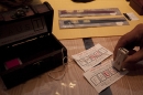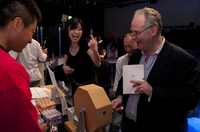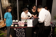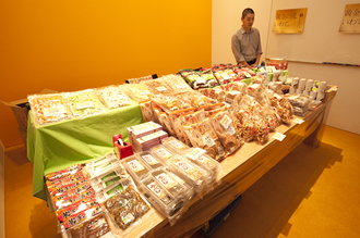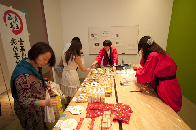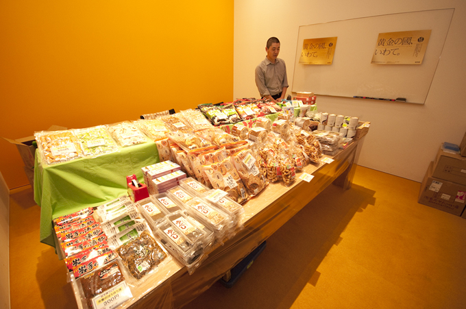 「 ZOKKON BOYS」のパフォーマンスが終わると、運営事務局によるパーティの主旨や遊び方についての説明タイム。今年は会場が1階と2階の2フロアに分かれ、2階を「東北物産フロア」とし、地場産業や伝統工芸を盛り上げるために、お酒や漆器といった東北の名産品をずらりご用意。またスタンプハンティングでは、2階フロアの各所に設置された宝箱を探して、そこに入っているスタンプを専用カードに押印。「F・A・U・S・T」という文字で埋まれば、1階でもれなくお土産をゲット。さらに2階の物産フロアで買い物をすれば、高級腕時計や自転車など、豪華賞品が当たるガラガラ福引の抽選権(1000円で1回)がもらえ、また東北地方の利き酒にも挑戦、と今年のガラパーティは復興への支援企画がもりだくさん!