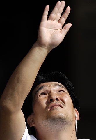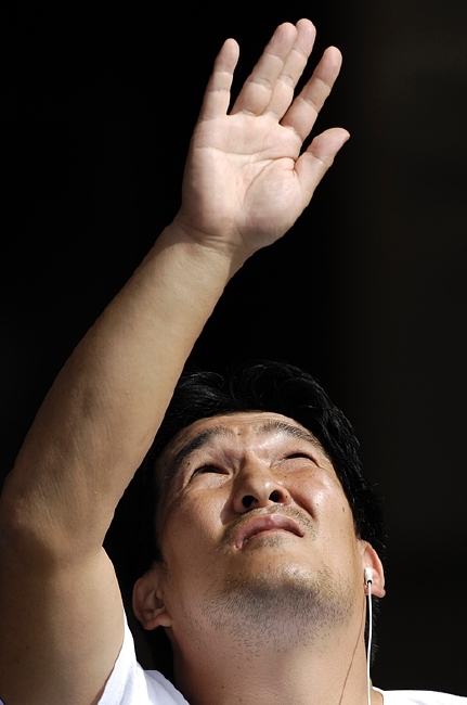 格納庫の脇で一人、イメージトレーニングする選手の姿。その中で外部の音を遮るためか、耳にはイヤフォンをしてイメージトレーニングに集中する芦田氏の姿があった。角度や高さ、タイミング、そのときのスピード……。手のひらを機体に見立て、細かくイメージしていく。