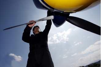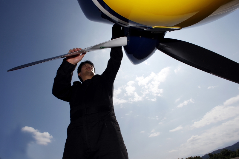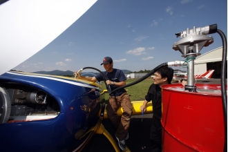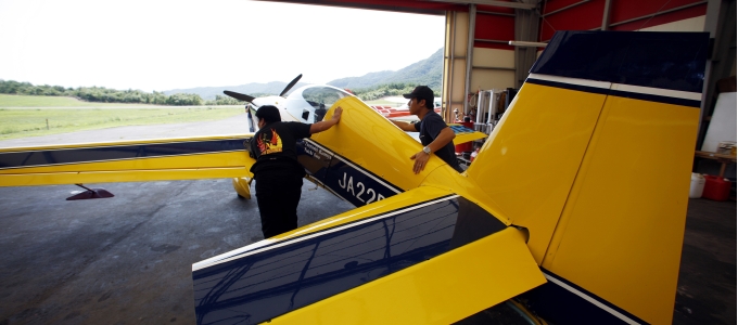 穏やかな日差しを浴びた二人は、機体の点検を始める。フライト前に決して欠かすことのできない作業のひとつだ。胴体、主翼、尾翼、プロペラ、エンジンなど、チェックリストは20以上を数える。ドライバーを右手に持った芦田が、ネジ1本までチェックしていく。