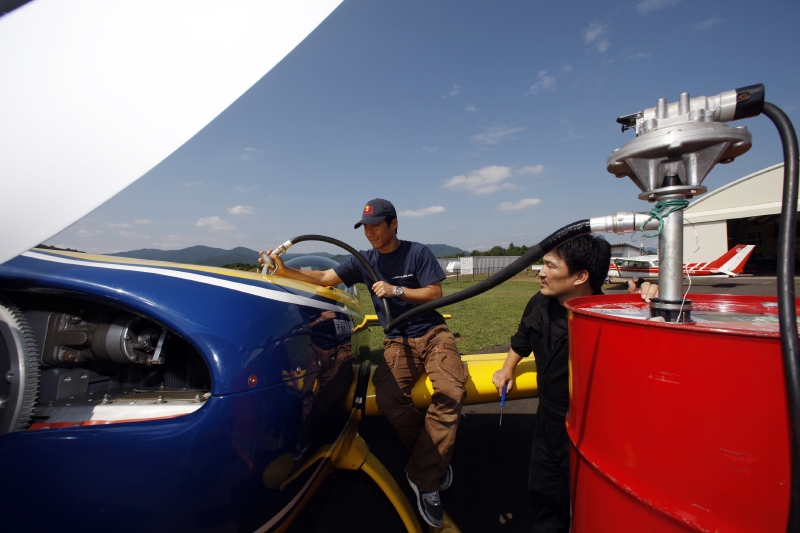 入念な点検ののちに給油を終え、フライト前の準備は整った。腰に巻いていたフライトジャケットに袖を通し、非常用のパラシュートを装着する。ヘルメットをかぶり、コクピットの前席に芦田が乗り込む。後ろの席に坐った室屋はサポート役だ。