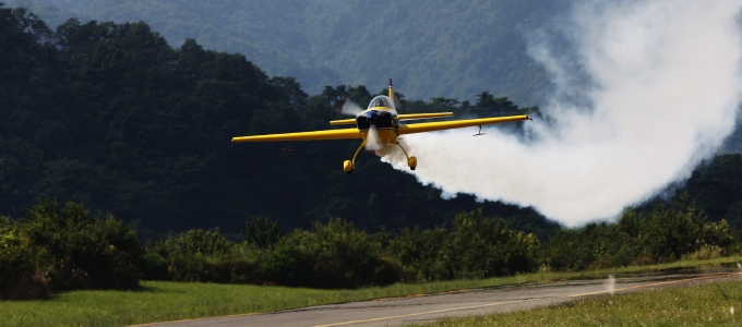 スピードをあげて浮上速度を確保した『エクストラ200』が、機体の前方から滑走路を蹴りあげる。エンジン音が遠ざかる。雲ひとつない青空に、イエローとブルーのボディーが軽やかに溶け込んでいった。