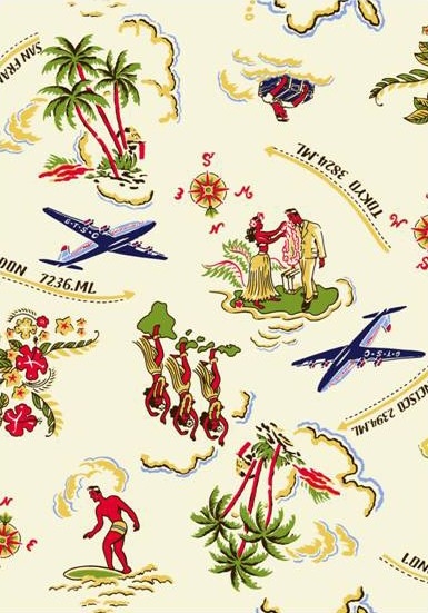 柄のテーマは、1954年にハワイで開催された世界初のサーフィン国際大会「マカハ・インターナショナル・チャンピオンシップ」。現在のサーフィン・コンペで採用される基準や方法はこの大会から生まれたことで知られ、ロコサーファーとともにマカハのビッグウェーブに挑むべく、オーストラリアや遠く英国からサーファーたちが集結した伝説的なコンペティションなのです。
