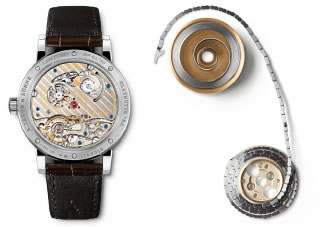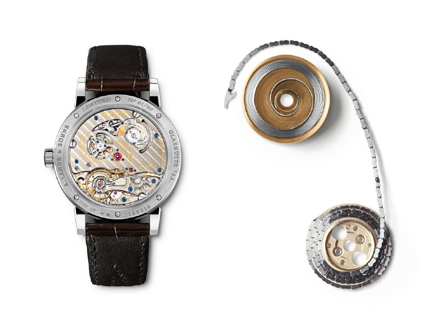 左写真:美しく仕上げられたシースルーバック。右写真:上がゼンマイの入っている香箱、下のチェーンが巻き付いているのがフュジー。ゼンマイ巻き上げ直後とパワーリザーブが終わりに近づいた時点での異なる力の差を補正するために、巻き上げたゼンマイのエネルギーを直接ではなく、636個の部品によって構成される細いチェーンを通じて伝達するチェーンフュジー機構。