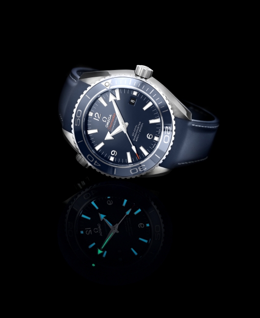 今回のリニューアルでは、こうした高性能ムーブメントを持つ同モデルに、600m防水時計初のサファイアクリスタルのケースバック(裏蓋)を採用し、時計の裏側から高性能なコーアクシャル・キャリバーを視認できるように。さらに、海外での時刻合わせも容易で、時刻の進行を妨げずに時針だけを調整できるタイムゾーン機能を搭載。そして暗がりでも鮮明に見えるインデックスと時分針に青色発光のスーパールミノバを使用し、ベゼルの12時位置と分針は緑色で、色で見分けられるようにという配慮も。