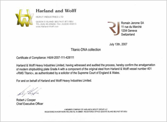 タイタニック号を建造したハーランド・アンド・ウルフ造船所から発行される証明書。現代のハーランド・アンド・ウルフ造船所にて使用される金属と、タイタニック号から引き揚げられたスチール部品との合金が、タイタニックDNAで使用されていることが明記。