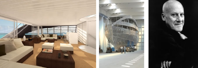 フォスター卿の得意とする、研ぎ澄まされたハイテクノロジーな美が存分に反映されています。180度見渡せるパノラマサロンを始め、積極的に取り入れられ た巨大なガラス壁が、船内と船外の境界をあいまいにし、ゲストを海との一体感へといざなう繊細なデザイン。そして、サロンから客室まで船上すべての雰囲気 を時間帯により変化させ、都会的なラウンジ空間から夜のプライバシー感までを演出する照明や天井に配したシステム。