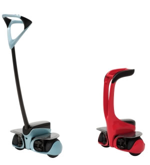 このウィングレットは、立って乗った人間を、すぅーっと滑るように運んでくれる2輪の電動乗り物ロボットです。ステップ部分はわずかA3紙ほどのコンパク トサイズで持ち運び可能。利用者は体重を行きたい方向にシフトするだけで、センサーが自動的に進行方向やスピードを検出(このあたりがロボットですね!) して、キュートで快適に行きたいところへとわたしたちを運んでくれます。