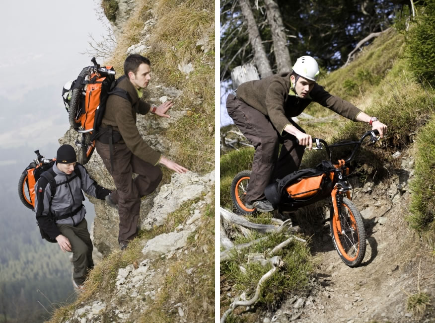 このバイクを開発したドイツ在住のアウトドアズマン、Thomas Kaiser氏によると「元々はトレッキングで下山する際、膝にかかる負担を軽減するためにマウンテンバイクを活用できるようにしたい、という発想から」と語ります。