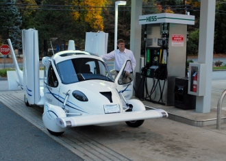 「トランジッション」は2シーター。小型自動車に折りたたみ式の翼がついていて、飛行する際は翼を広げ、プロペラで飛びます。翼を閉じれば、車幅も6.8フィート(約2m)なので、通常の車庫に駐車が可能。飛行機から自動車への“変換”作業は、たった30秒でできるとのこと。ただし、自動車というより、“道路を走れる飛行機”といった方がよさそうで、離陸や着陸のために多少の滑走路が必要。パイロットとしての講座受講も必須です。