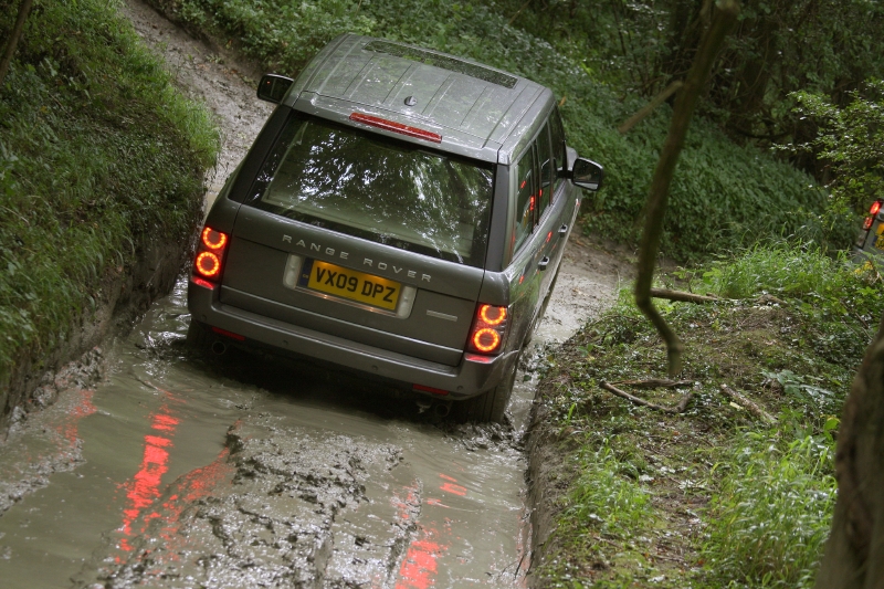 ここは「ランドローバー・エクスペリエンス」と呼ばれる彼ら自慢のオフロードコースで、テストコースとしてクルマの開発に大きく携わっている場所です。コースは主に林間で、泥路を登ったり下ったり。ダウンヒルは30度以上あるでしょう。