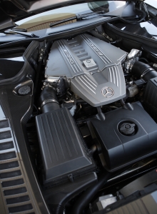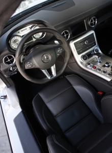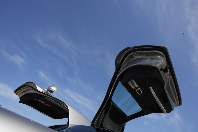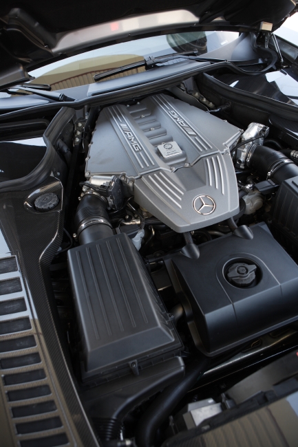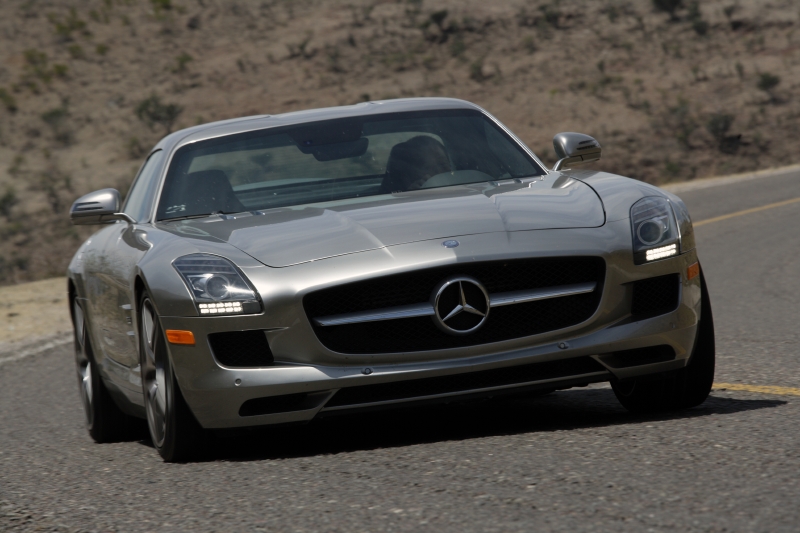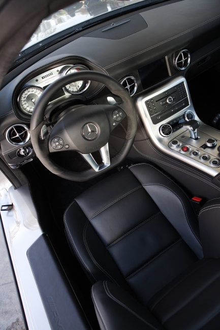 さて、同コースでのテストドライブが実現した「SLS AMG」についてご説明しましょう。これはメルセデスAMG社が40年以上に渡る歴史の中で初のAMG専用モデルとして開発した新世代のスーパーカー。同社がモータースポーツ活動を通して培ってきたレーシングカーテクノロジーとメルセデス・ベンツの最先端技術が結集されており、徹底的に軽量化を図ったアルミニウム製スペースフレームはまるでレーシングカーのような構造。そして、エンジンはAMG6.3リッターV8を搭載。一見すると既存のラインナップにあるAMGエンジンのようですが、こちらもレーシングカーのごとくオイル潤滑方式をドライサンプにするなど、かなり手が入っています。そうそう、ガルウィングを持つことも忘れてはならないディテールですね。最高出力こそ50psSLRマクラーレンに届きませんが、プライスは半分以下の2430万円に設定されています。