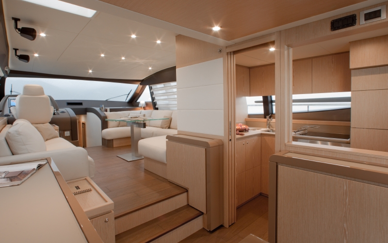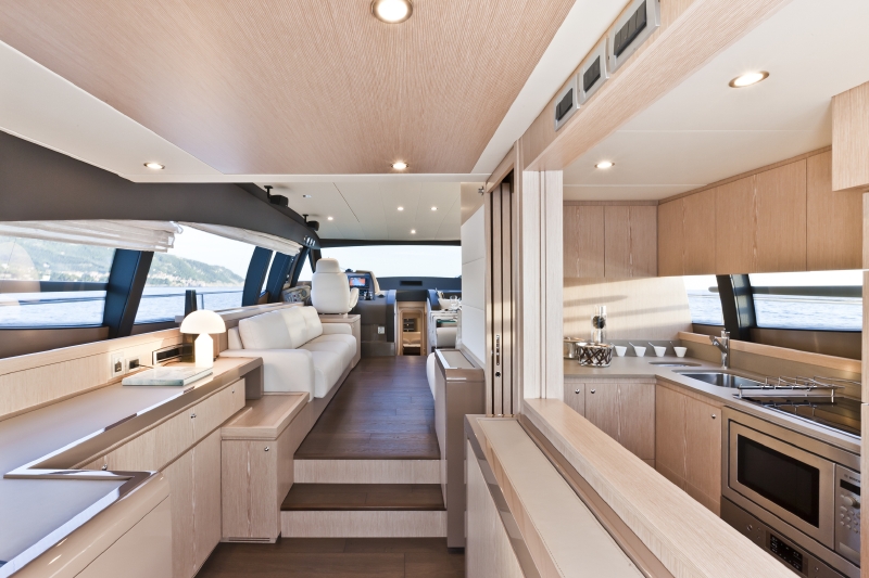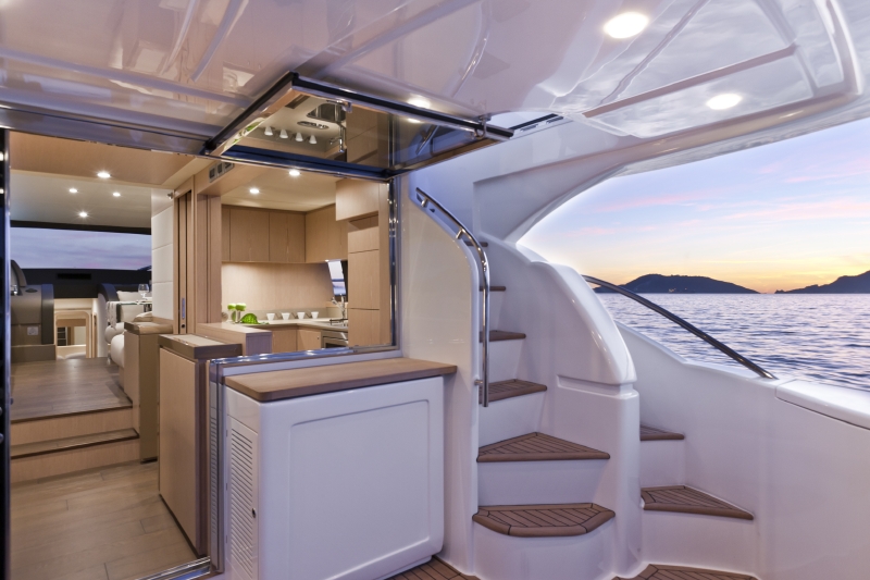 さらに60フィートのフロントウインドウにはシングルガラスを大胆に採用。また自由な設計はギャレー、つまりキッチンルームの位置にも現れています。従来ならサロンの前方奥にあるキッチンルームが、F620では後部に配置。後部デッキからサロンに入ってすぐ右に広いキッチンがあるレイアウトなのです。デッキとサロンを隔てるチルトウインドウを跳ね上げればキッチンのバーカウンターが現れ、ホテルのプールサイドバーのようにドリンクやフィンガーフードのサーブが受けられます。それは、まるでニューヨークスタイル。デッキパーティだけでなく、ひと泳ぎしてボートに上がり温水シャワーを軽く浴び、素足のままチークの貼られたデッキへ。そしてシャンパンという機能的な設えも魅力です。(右:上段写真)
