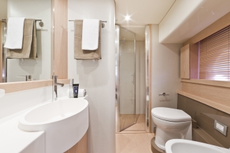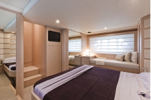船の幅いっぱいに広がるオーナーズステートルームは明るいゆとりに溢れている。左右のシービューウインドウが充分な光と煌く海水面を見せてくれるからだ。もちろんゴージャスなキングサイズベッドにロングクルーズに対応するためのウォークインクローゼットを採用しているため、オーナーはリゾートウエア以外のドレスコードにも十分に対応できるだろう。さらに専用のパウダールームをセンターに両舷にシャワールームとトイレスペースを離して用意している。こことほぼ同じ設えがバウのVIPステートと右舷の2ベッドのゲストステートにも採用。もちろんそれぞれ専用のシャワー&パウダースペースをもつ。