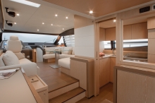 明るく開放感溢れるサロンは淡いブリーチドオークとマルーンのブラウンにトーンコントロールされ、気品とカジュアルを融合。いわば重厚感というそれまでのサロンが持っていた重い鎧のイメージを脱ぎ捨てた勢いだ。マキシボート並みのスペースを持つギャレーはサロン後端に位置し、障子状のサイドウオールは電動で格納できる。アフトデッキからもサロンからも使い勝手のいいレイアウト。もちろん大型冷蔵庫、シンク、4バーナコンロ、電子レンジ&グリル、デッシュウオッシャーとキッチン設備はロングクルーズにも万全。バーカウンターとしてのみならず朝のモーニングに始まりランチ、ディナーまでその気になればいつでも対応可能だ。