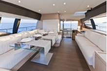 全長18.77m、全幅5.25mのF620、その白磁の肌を思わせる白い外観の船体は、気品に満ち溢れています。側面のワイドウインドウは、繊細かつ斬新なスタイリング。サロンエンドのピラーから延びるアイライン、ウインドウのキャラクターラインにはエレガントさが潜むよう。また、低重心なイメージの象徴として、低いレーダータワーをフライブリッジ後端に置き、スポーティなフォルムを作り上げています。これらはいずれも「スタジオZUCCONインターナショナル・プロジェクト」が担当した刺激的なデザインワーク。
