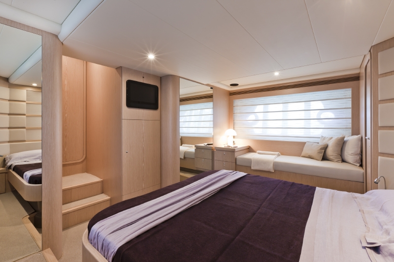F620では、さらに革新的にと、ゲストルームの窓も大型化して、開閉可能なウブロを追加。ちなみにステートルームは3箇所用意され、オーナー用のメインステートは船体いっぱいに広がるスペースを保っています。こちらもブリーチドオークのトーンコントロールが施され、モダンな上質感を演出。もちろんそれぞれの部屋には専用のシャワールームとトイレ&パウダールームを設置。(下段:右写真)