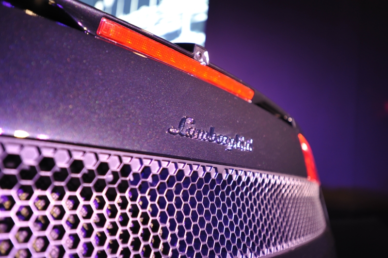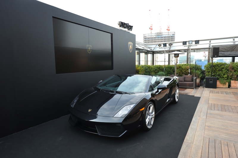 3月末、ランボルギーニは、銀座のブランドストリートのランドマーク的存在である、ブルガリ ホテルズ&リゾート・東京レストラン「ラ テラッツア・ラウンジ」(ブルガリ銀座タワー屋上)に、展示されていた。シックなブラックのステージによく似合う。どこから搬入したのか不思議に思っていたら、すぐにその疑問は解消された。どれだけの手間と費用がかかるのかわからないが、タワー屋上までクレーンで吊り上げる過程を映し出したビデオが流されていたからだ。見るものにインパクトを与えるランボルギーニらしい演出だ。