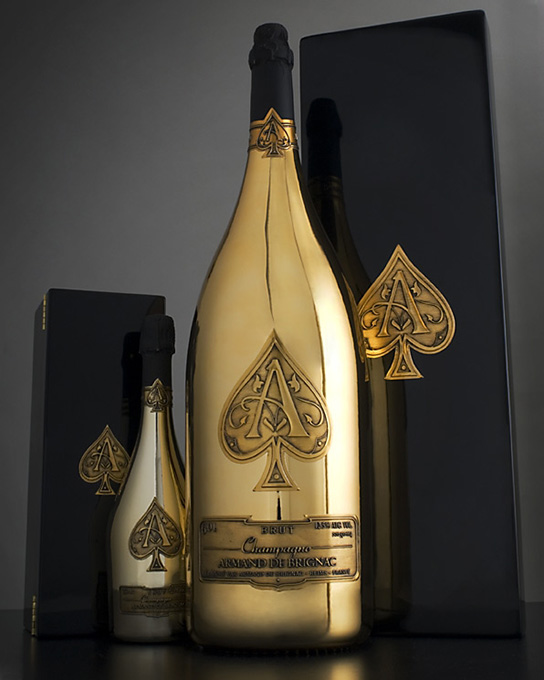 勝利のシンボルとされる輝くゴールドのボトル。アルマン・ド・ブリニャックは特に優れた3つのヴィンテージをブレンドしたマルチヴィテージ・シャンパーニュ。ボディのある芳醇な味わいをもたらす。右側のボトルはマチュザレムと呼ばれる6リットル入りのボトル。通常ボトルの8本分に相当。