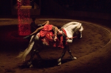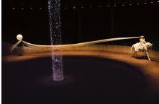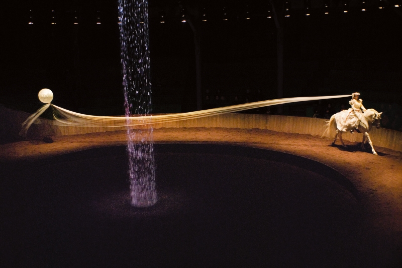 この騎馬スペクタクルをサポートするのは、エルメス社。『ジンガロ』の旗手が使用する鞍も、同社会長のジャン・ルイ・デュマがバルタバスのために特別にあ つらえたものです。19世紀初頭に誕生したエルメス社の使命は、騎手の要求を正確に伝えて馬をより機敏に動かすことでした。そして馬に対する愛情、伝統へ の情熱、職人芸へのこだわり、唯一無二の存在でいたいという想いは、『ジンガロ』とエルメス社の双方に共通する概念。馬具から垣間見ることができる、人間 と馬との関係も、公演で着目すべき点でしょう。