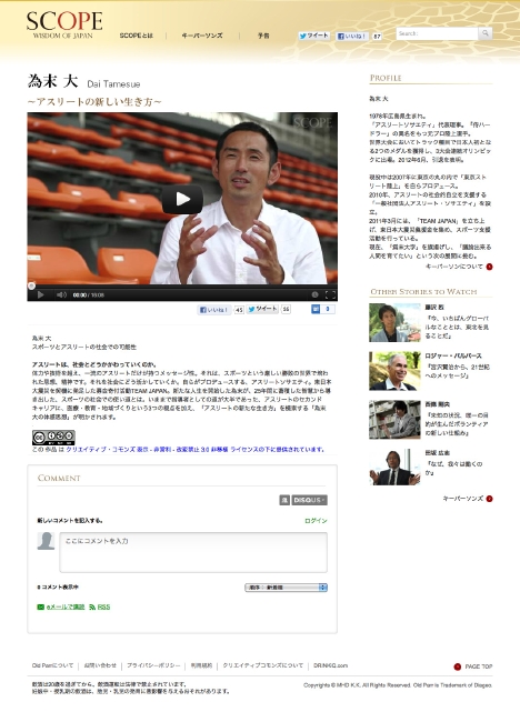 さて、そのSCOPEが、現代日本が抱える様々な問題――国際関係、国際競争力、東北の復興、エネルギーといった課題を考える日本オリジナルの知恵を見出すべく、12月3日、キーパーソンを招いてフォーラムを開催する。各界で国内外を問わず活躍する人々の知恵を呼応させたいという試みだ。このフォーラムもサイト同様に開かれた場となっており、参加者100名を公募(抽選)している。