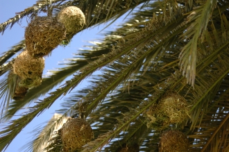 一見、木の実に見えますが、これはパームツリーの枝に作られた鳥の巣。1本の木に50個前後の巣が。